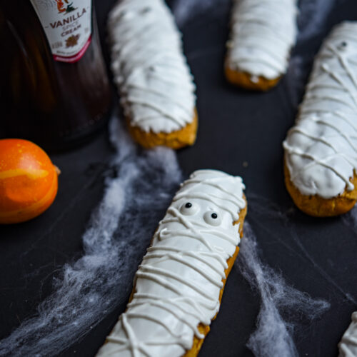 These Amarula Vanilla Spice mummy eclairs are my second halloween recipe for Amarula. With their little googly eyes and piped bandages they just look so cute and they are so easy to achieve.