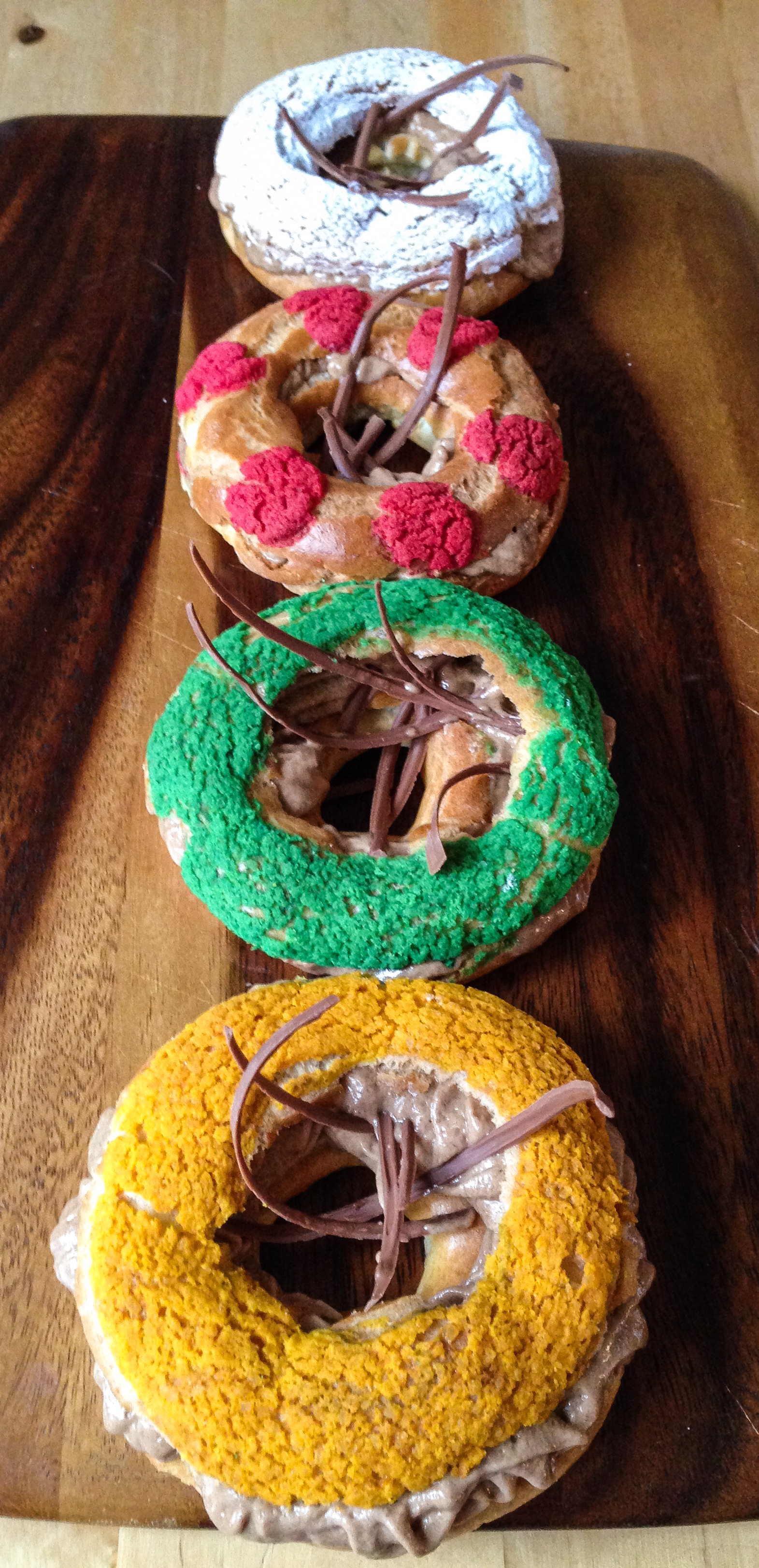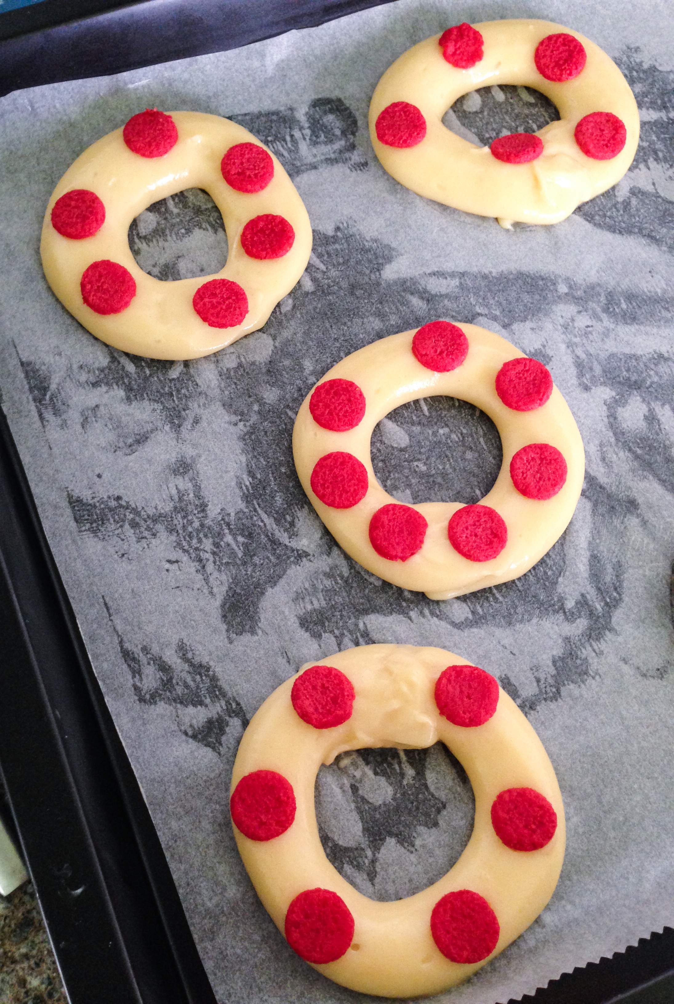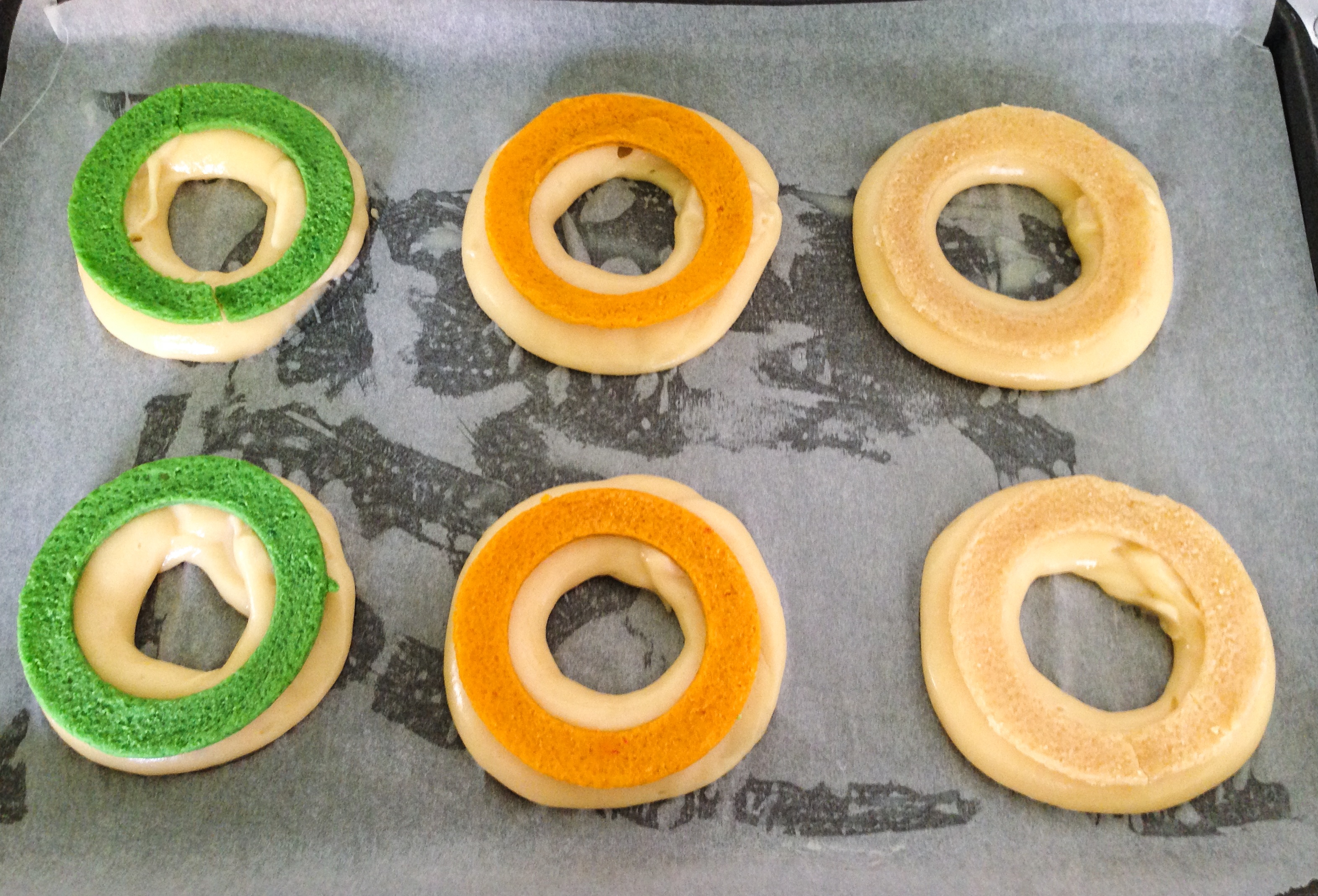 These were actually really easy to make, choux pastry was piped into rings, and topped with dyed streusel rings. The streusel was pretty tricky to handle, so the trick was to roll the streusel out between two sheets of baking parchment and then freeze it, before attempting to cut out the streusel rings and circles.