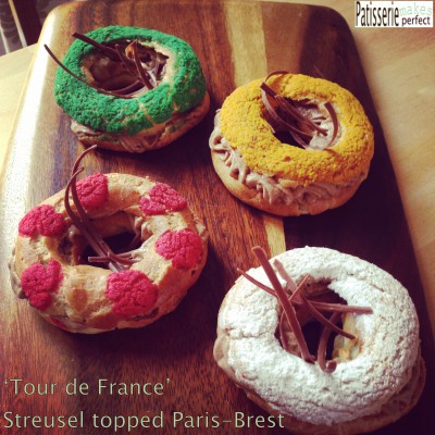 The idea behind the Paris-Brest was to take the streusel recipe from the Religieuse I had made from the LPDR book and dye it (I had seen this done in ‘the book’) to match the colours of the four main jerseys in the Tour de France.