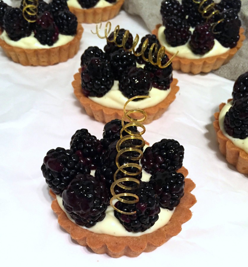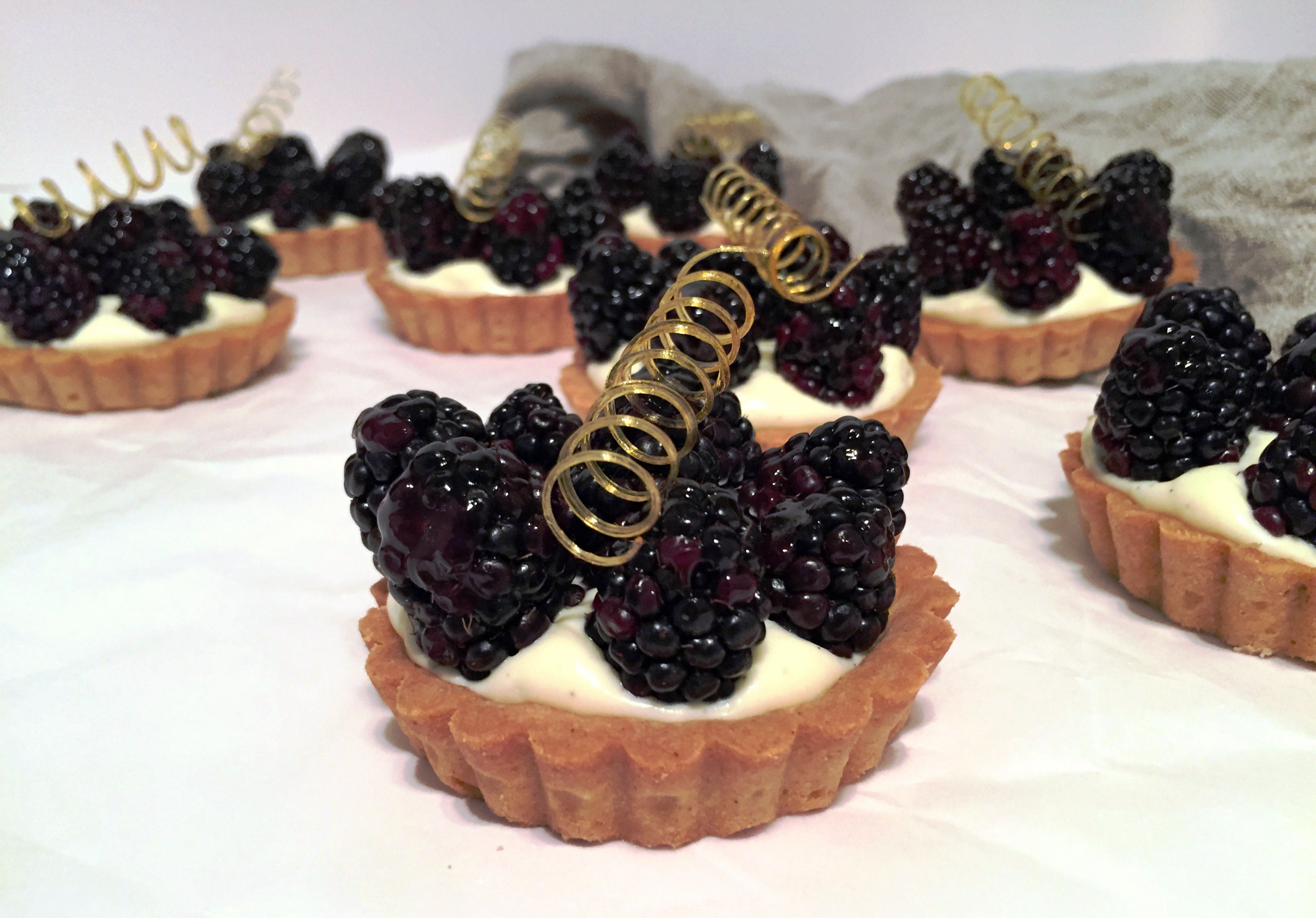 - Allow the cooked tartlets to cool on a rack before filling them to the edge with creme diplomat. Decorate the tartlets however you like with the blackberries.