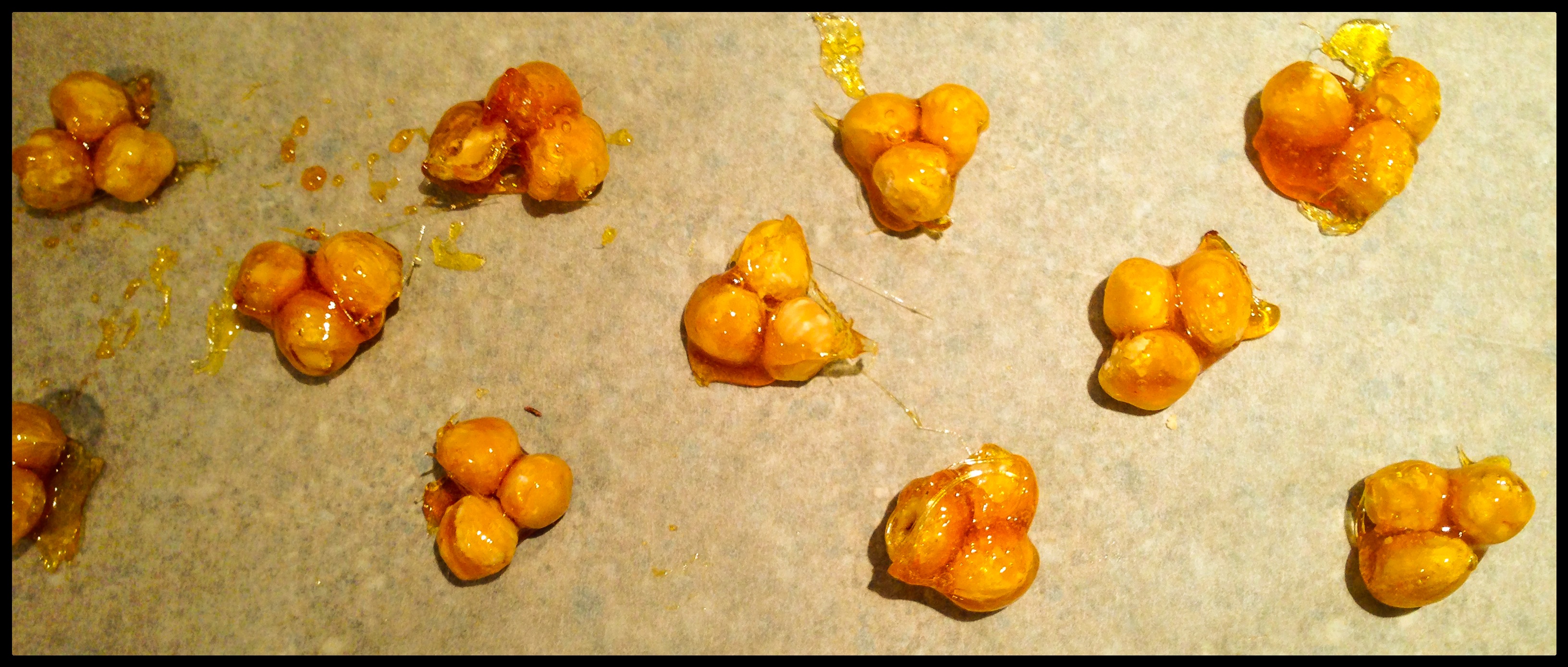 - Now work quickly. Drop three hazelnuts into the caramel and using a teaspoon, scoop them out and place the cluster on the greaseproof paper. Repeat this so that you have 12 clusters in total. If the caramel begins to set too quickly, heat the pan again on a very low heat to melt the sugar, keep doing this until you finish your clusters.