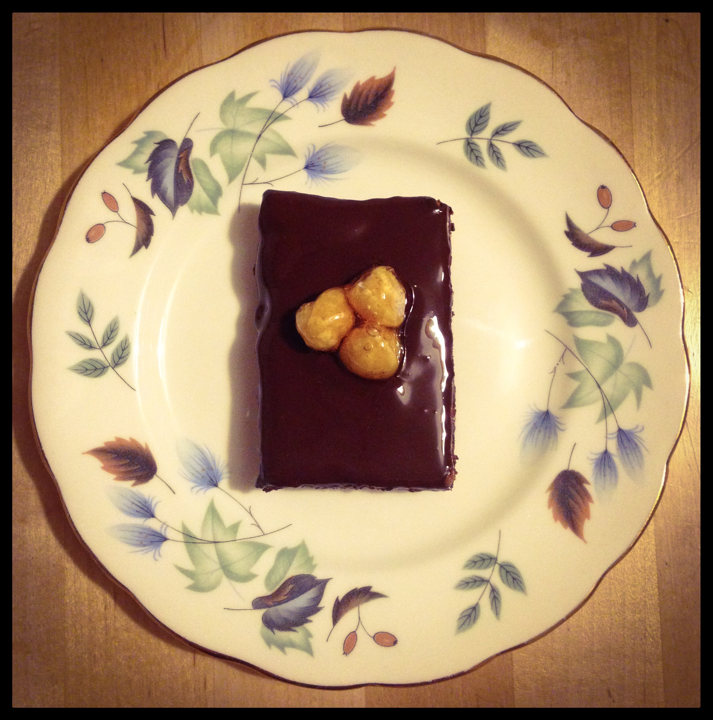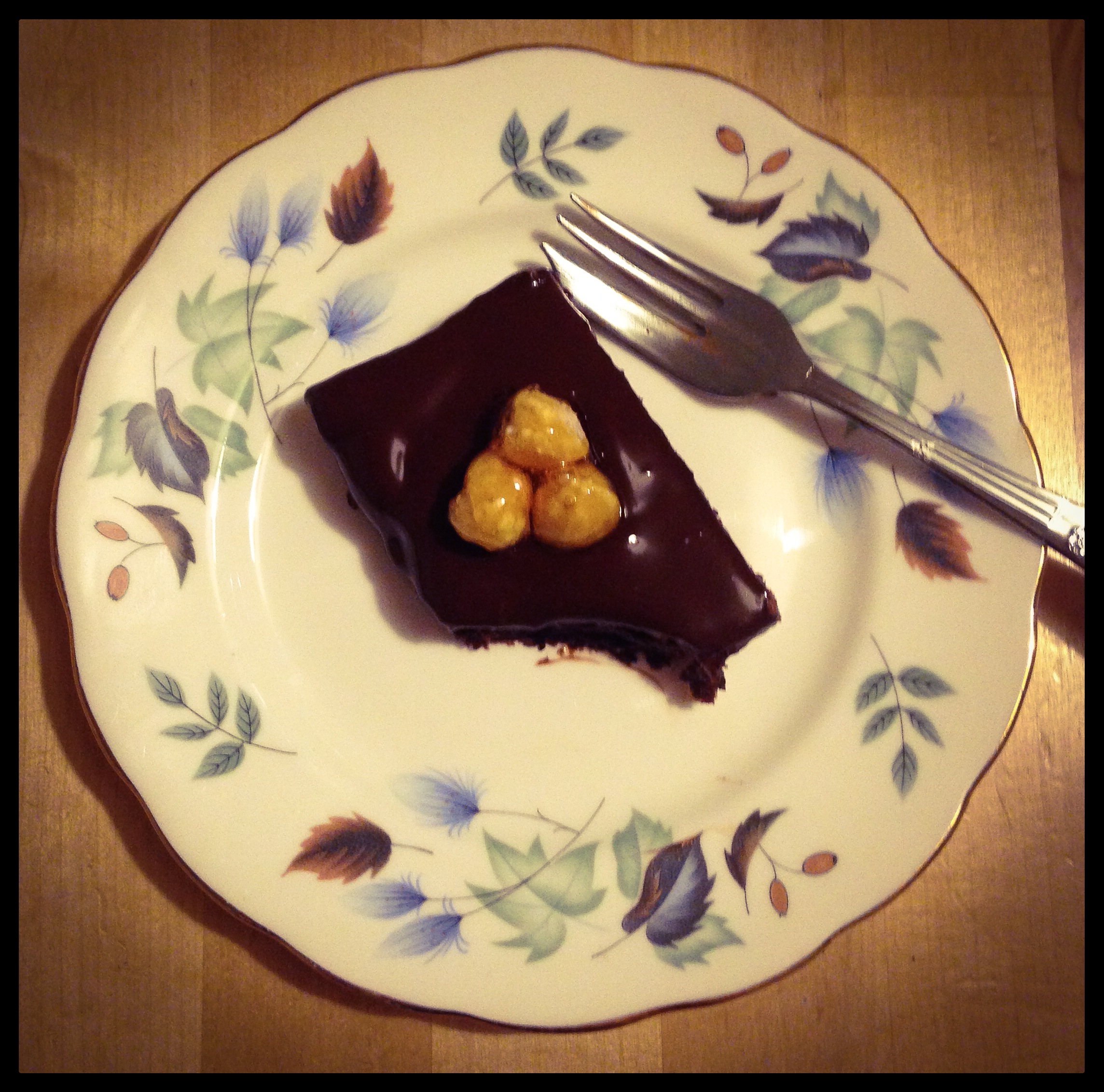 By now the cake was chilled enough that I could cut it into slices and decorate it with the hazelnuts.
