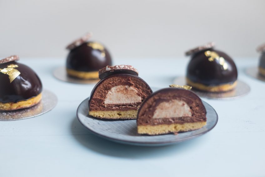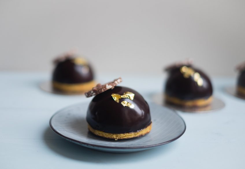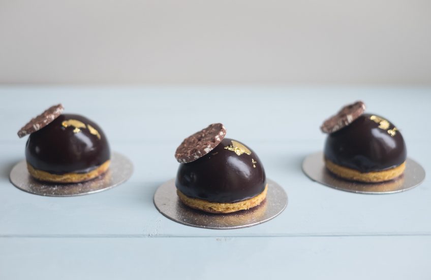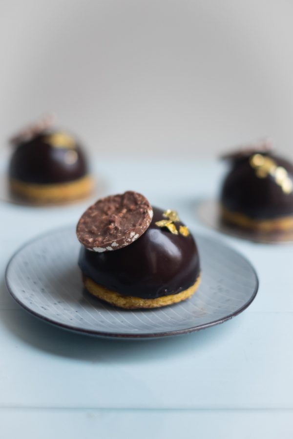 - When the glaze has finished dripping place a dome on top of a sable breton on the flattest side. Take the remaining 6 chocolate discs and place them on top of the domes at an angle. Decorate with gold leaf.