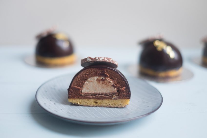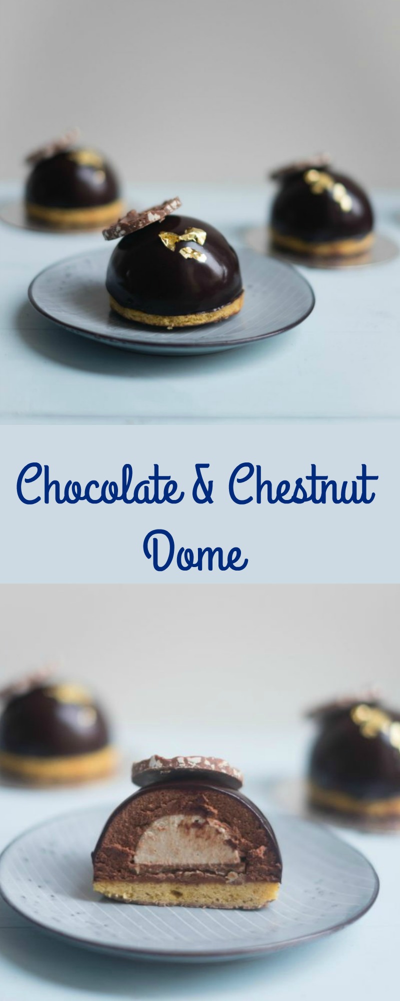 The chestnuts in this recipe are pureed and I used Merchant Gourmet‘s chestnut puree, it’s a great unsweetened puree meaning you can use it for so many things. These domes are made up of a chestnut mousse on top of a disc of hazelnut chocolate, surrounded by chocolate mousse and chocolate glaze, sat on a sable breton.