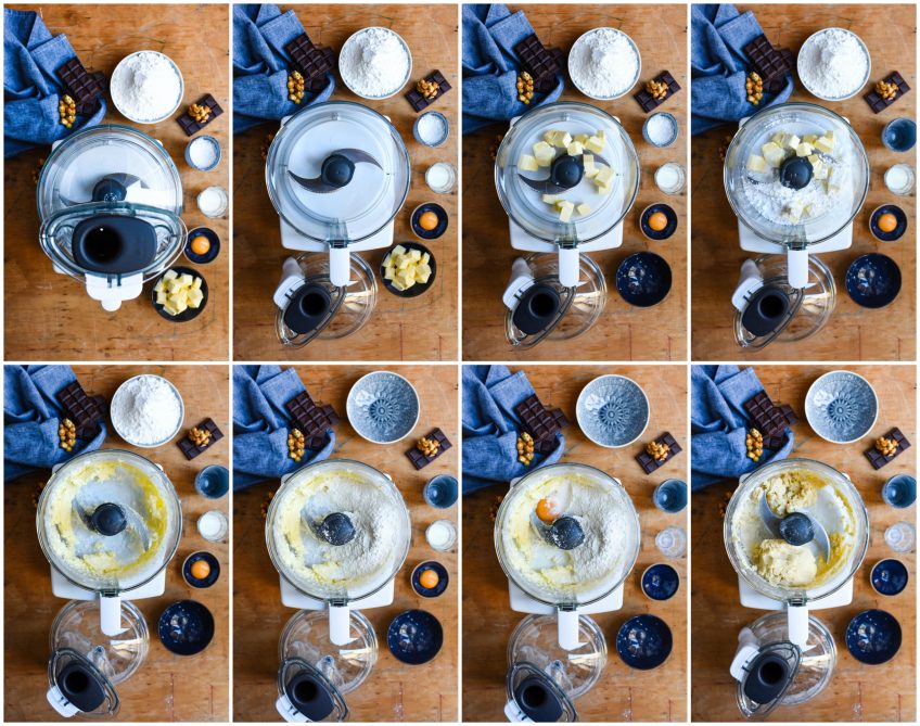 - Next make the pastry. Place the flour and butter in the food processor and gently mix until it resembles breadcrumbs.