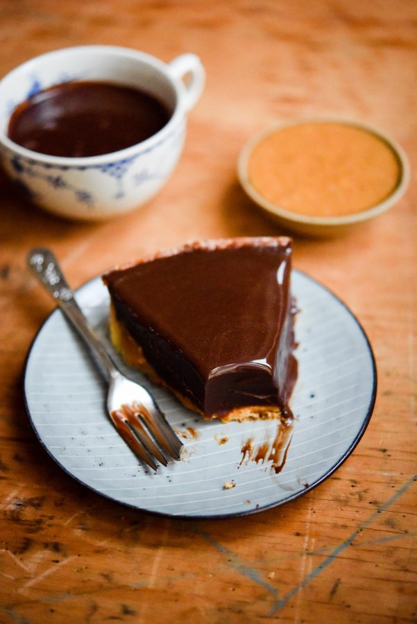 - Pour the chocolate mixture into the tart case, making sure it covers the hazelnut paste completely and place in the fridge to set for two hours.
