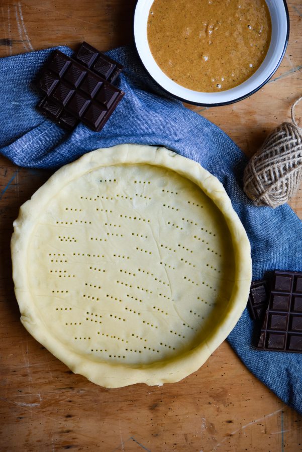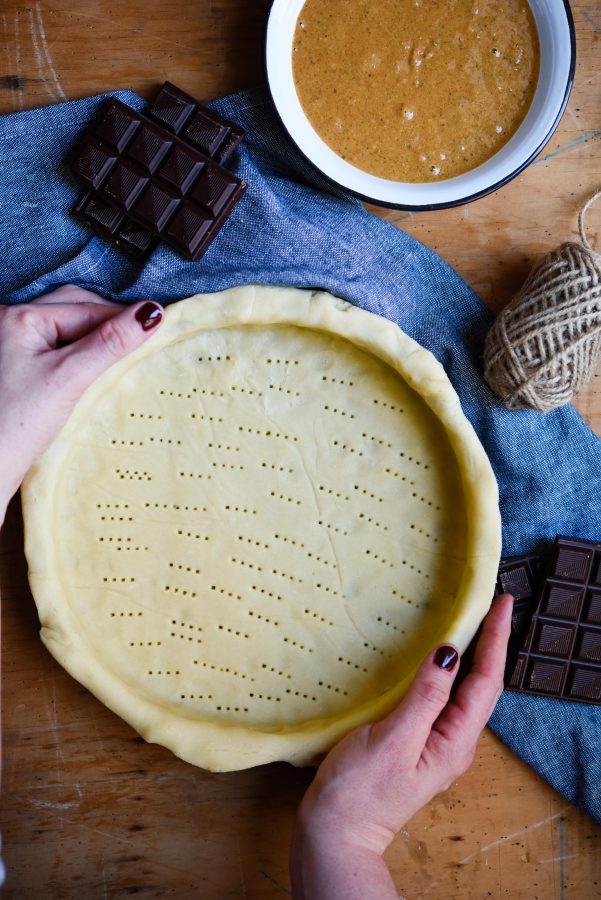 - Take a few spoonfuls of the hazelnut praline paste and cover the base of the pastry with an even layer about 2-3mm thick and place the case in the fridge.