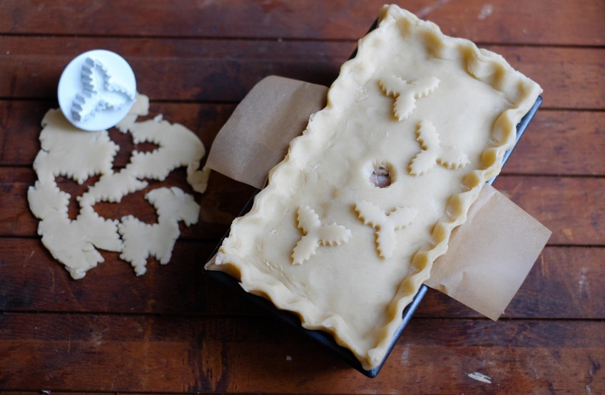 - Roll out the remaining piece of pastry (at this point reserve a little if you want to decorate the top), cut it to size if necessary and then brush the exposed bits of pastry in the tin with the egg so the lid can be stuck together. Crimp the edges of the pastry together and then cut a hole in the middle of the pie, decorate with holly leaves or any decorations of your choice.