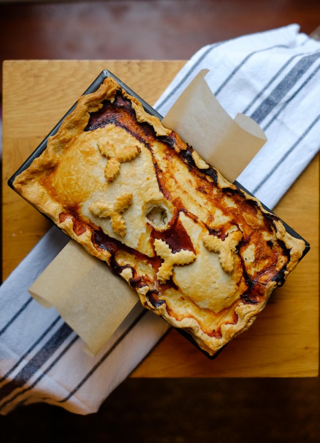 You can decorate the top of your pie however you like, I went with holly to increase the festive theme. The pie is made with a hot water crust pastry, which is so easy to work with and a really forgiving pastry. It’s the same recipe I used for my hand-raised pork pies.