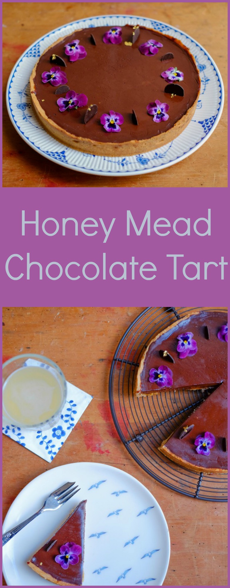 I used the mead to create a chocolate ganache layer for the tart, I used a mixture of 71% dark chocolate from Mast Brothers that is slightly smokey and some 66% dark chocolate from Amedei. The recipe for the ganache was based on a champagne ganache in William Curley’s Couture Chocolate book, I just swapped the alcohol and kept the same ratio to chocolate. These strong chocolates against the sweetness of the toffee apple curd and the caramelised almond pastry is the perfect combination. The honey mead gave the ganache a very silky texture, which is very soft set in the finished tart.