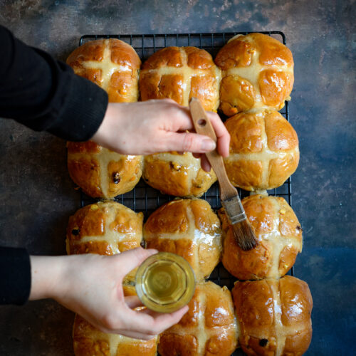 - Pre-heat the oven to 180C/160C Fan and when the buns are ready, pipe a cross on top and place them in the oven. Bake for 15-20 mins until golden.Remove from the oven and glaze immediately, leave to cool.