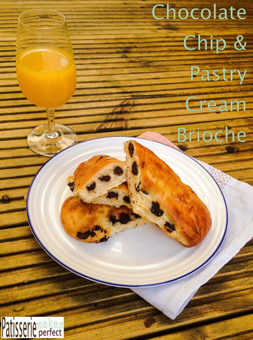 Up first, brioche. I tried a recipe for brioche filled with creme patissiere and chocolate chips. The pictures make these look very tasty, but I think the reason they tasted so nice was because of the chocolate and the creme patissiere. The dough was quite dry and although it had a lot of rise, when cooked they were very dense. They were also hard to shape as ‘the book’ recommended chilling them for two hours.