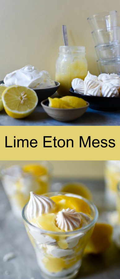 Can you believe this Lime Eton Mess is made from leftovers? When I made my Gin & Tonic Layer Cake the curd recipe made more than I needed. I also made meringues to decorate the top of the cake, of which, I only needed a handful. Some recipes just cannot be halved or reduced, for example life’s too short to weigh out half an egg yolk to make some curd. Also the bags of lemons and limes I had bought were all unwaxed and I really needed to use them up. As you can see from the photos, I had used all the limes to make the curd and the cake!
