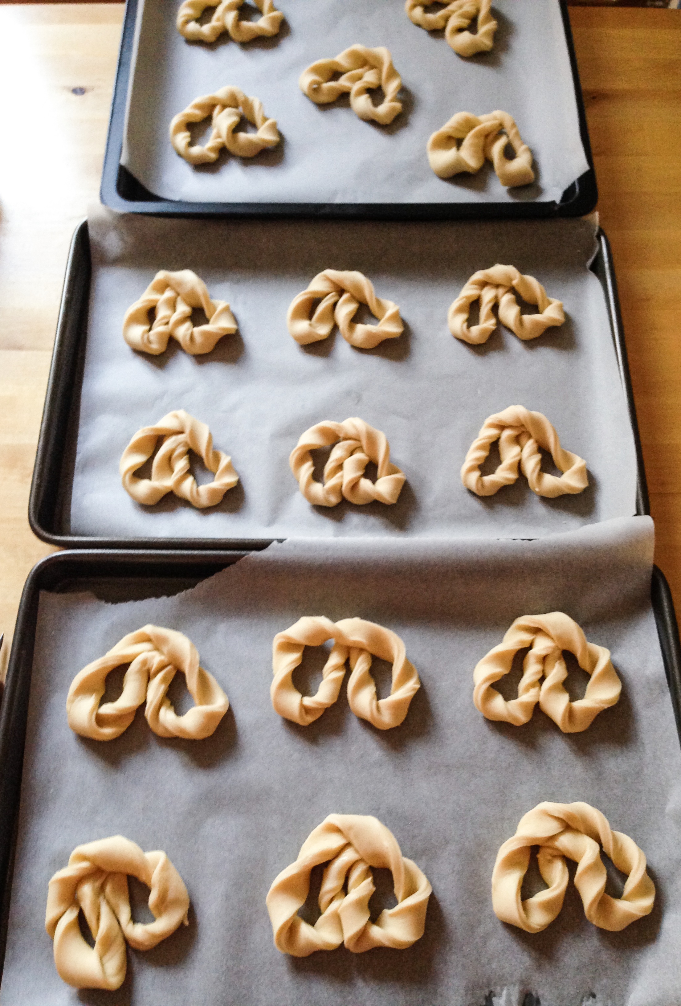 When it’s finally ready, the dough is rolled out and cut into 1.5cm strips. These are then twisted and shaped to make a pair of lunettes.