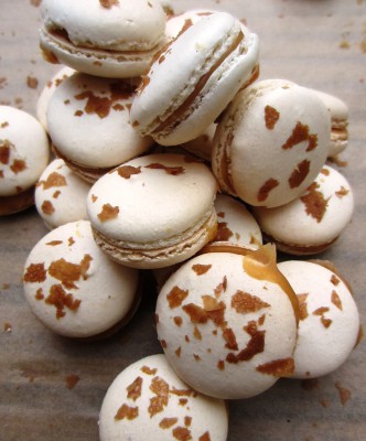 These macarons are smaller than I normally make, I used a guide for piping that I found online, whilst the macarons look cute at this size, I much prefer them 4-5cm in diameter. They are much more substantial at this size and the cake-like texture of the macarons taste fabulous. I think that the feuilletine decoration looks really striking on top of these macarons and they give a nice crunch to the shells.