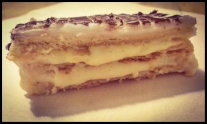 The traditional mille-feuille is a mix of three layers of puff pastry, sandwiched together with (yet more) creme patissiere and topped with fondant icing and chocolate decoration.