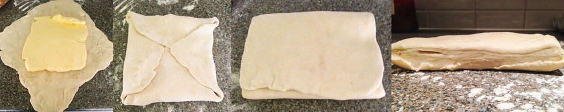 The ends of the pastry are folded in like an envelope and the pastry is rolled out in a long rectangle. The pastry is then folded up like a letter, turned 45 degrees clockwise and rolled out again.