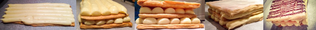 The creme patissiere was piped onto the bottom layer of the pastry, topped with another layer of pastry and more creme patissiere is piped before a final layer of pastry is added.