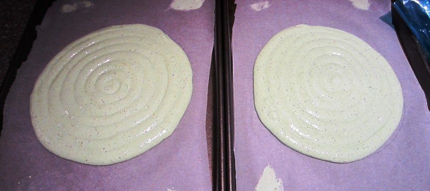 The mixture is then piped into two 20cm circles, starting in the centre and spiralling out towards the edge, to be honest out of the entire recipe, this was the part I was most worried about, but it’s actually really easy and the mixture merges together really smoothly. Normally with macarons you tap the pan on the side to remove any bubbles and to flatten the macarons. As I have gone to the trouble to pipe this pretty spiral, you really don’t want to tap these pans, just put them in the oven as they are.