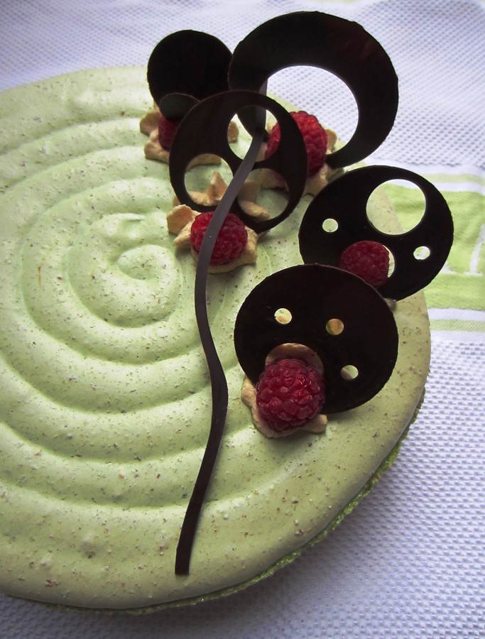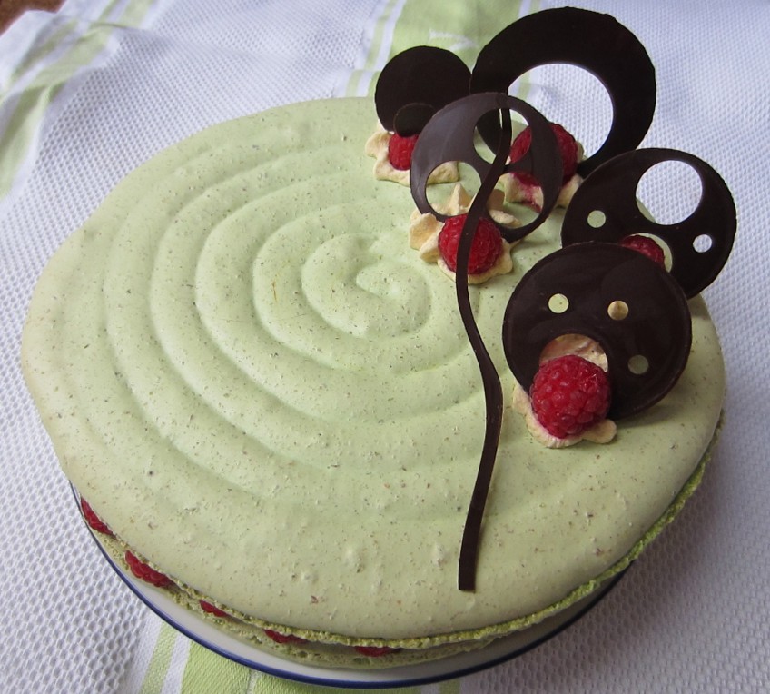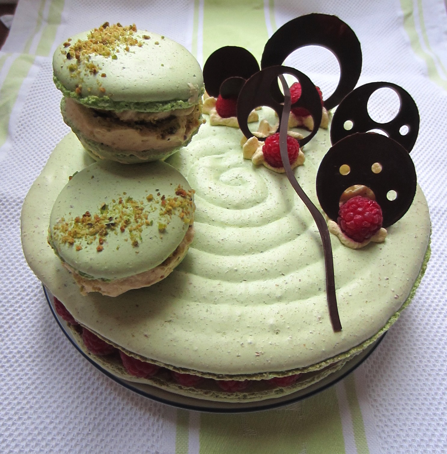 I chose to decorate the top of the cake with tempered chocolate decorations, raspberries and pistachio cream to act as a glue, the smaller macarons are decorated with chopped pistachios before baking. If anyone would like me to do a post about chocolate decorations and chocolate transfer sheets, do let me know in the comments as this is something I would be happy to do.
