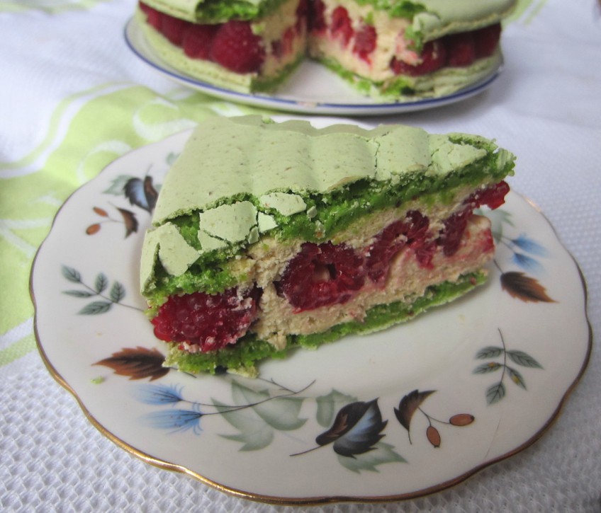 - Pipe more pistachio cream over the raspberries, but don’t go too the near edge and spread it round with a palette knife.