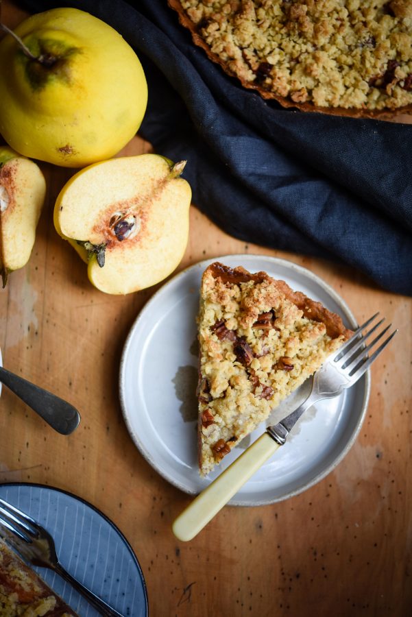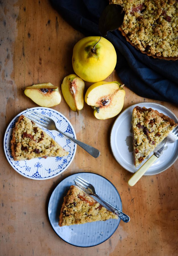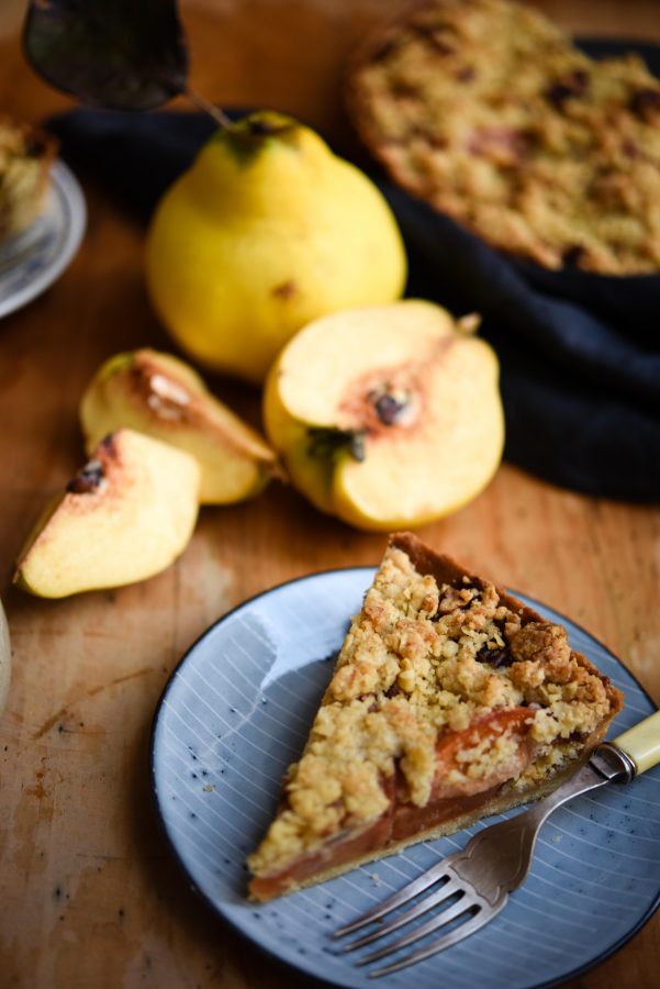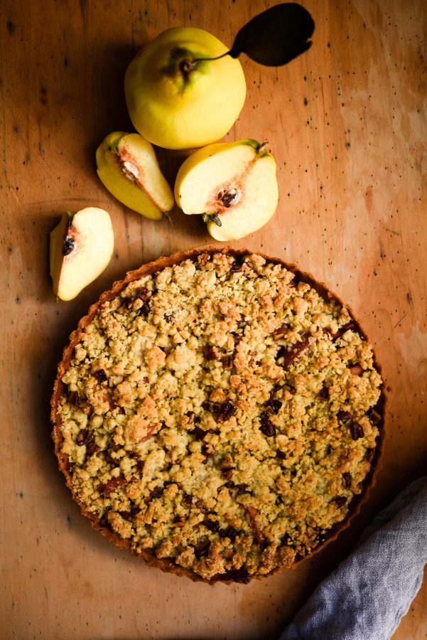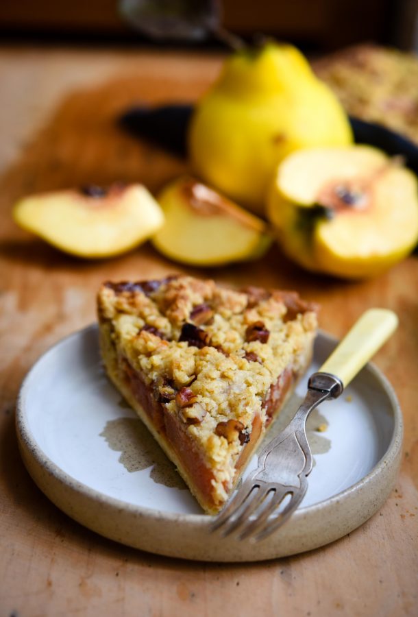 Quinces sure do sound delicate. Had no idea they were difficult to come by. Boy, I do love a crumble! Especially blueberry. 🙂 This tart looks perfect for the fall, it’s making me anxious for Thanksgiving and some of my mom’s apple pie. Maybe I can talk her into making an apple crumble tart instead! 😀