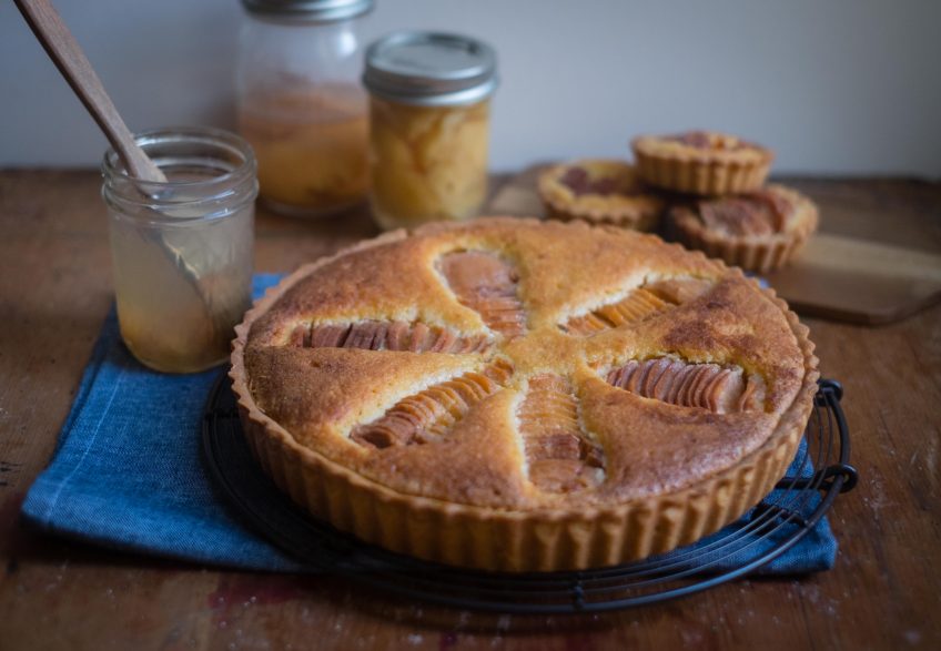 Thankfully I had made twice the amount of pate sucree I needed, I had jars and jars of poached quinces from this bumper crop, more ginger curd and due to an error with a delivery, lots of extra bags of ground almonds.