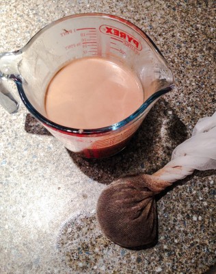 In the back of the cupboard, I found a nylon jelly bag, bingo! It worked perfectly and I was able to strain my coffee infused milk and remove the coffee grounds. The worst part was squeezing the bag of grounds full of hot milk. Ouch!