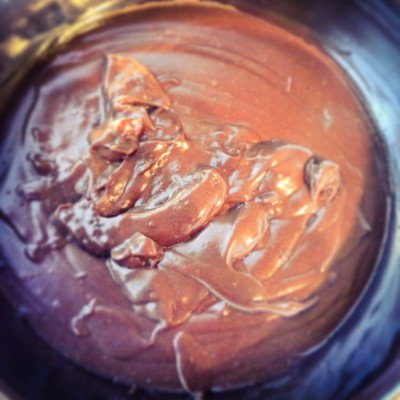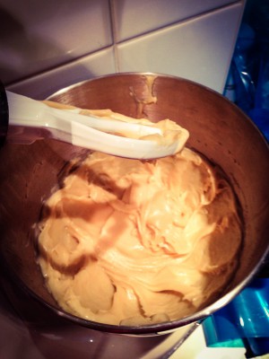The chocolate coffee milk was added to the egg mix in stages until it combined evenly. The whole lot was then poured into a saucepan and heated again until it thickened. When the mix had thickened, butter and fleur de sel were added and the creme patissiere was put in the fridge to cool.