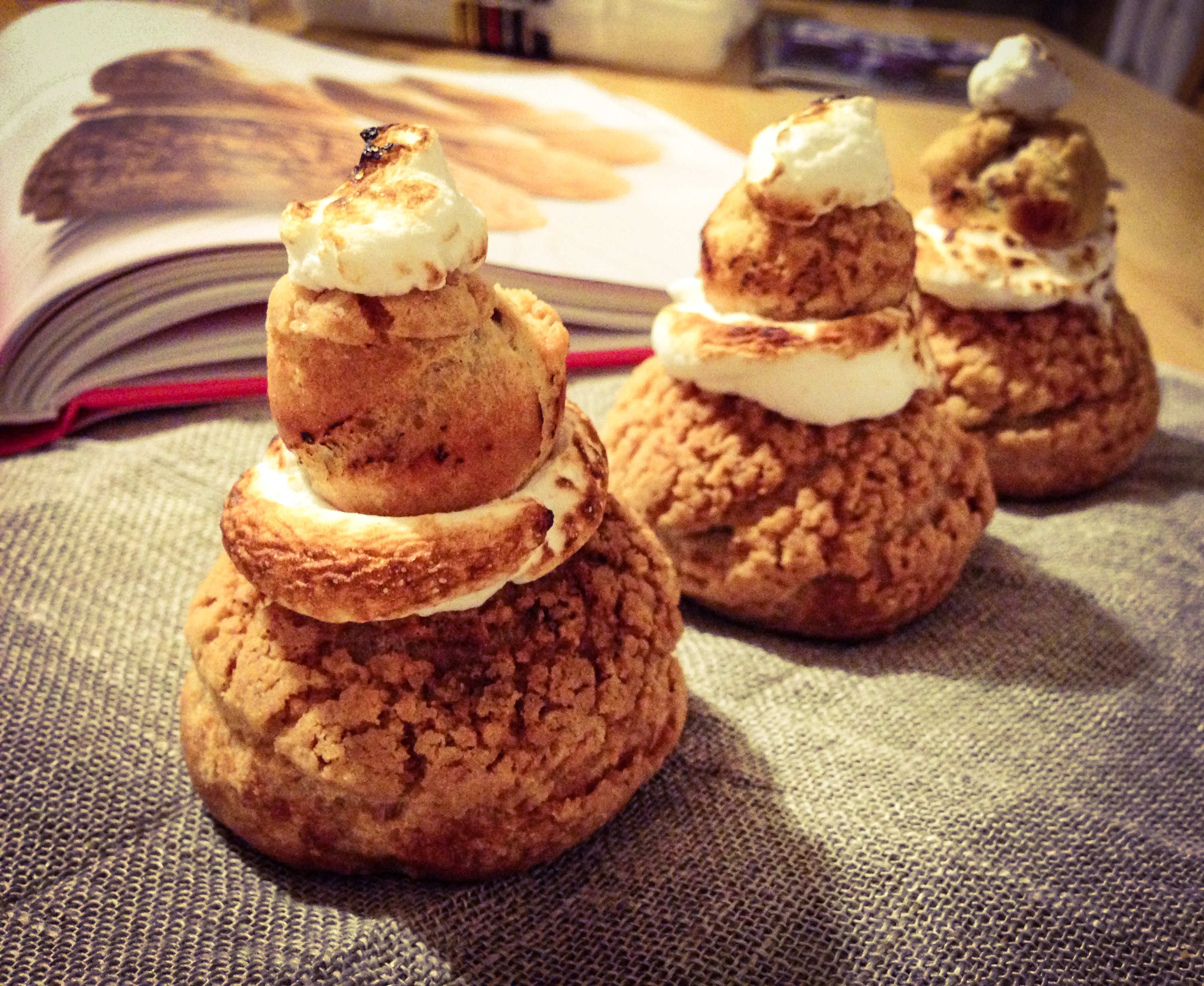 I piped meringue on top of the large choux pastry case and then sat a smaller case on top with a small blob of meringue sat atop of it. I then had to use my blow torch to crisp up the meringue and give it a nice brown colour.