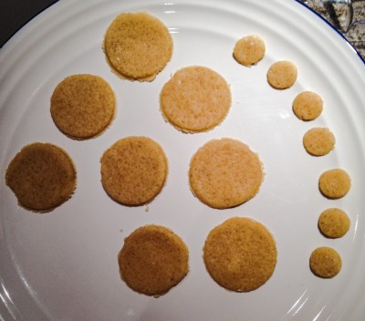 - Using a pastry cutter or a small glass to guide you, cut out 7 streusel rounds 2cm in diameter and 7 rounds 4cm in diameter.