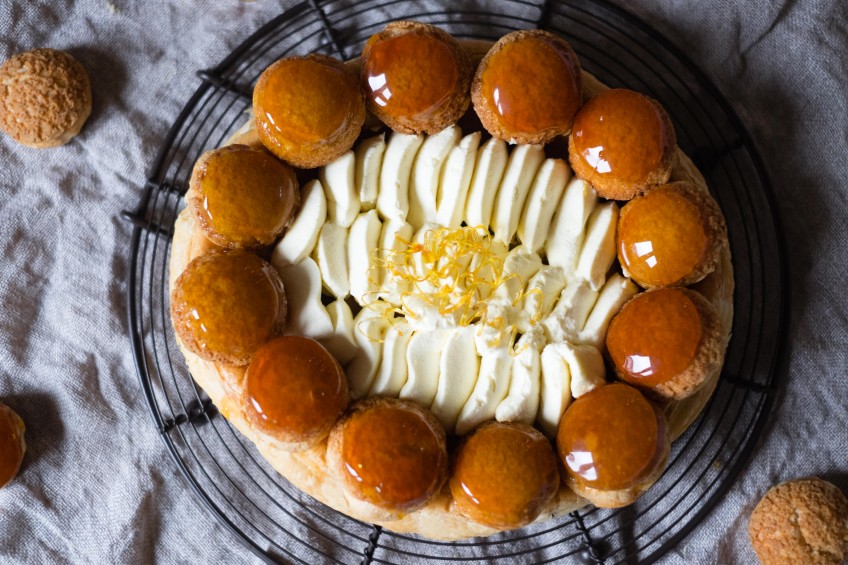I’ve always wanted to make a St Honore, but I always found them a bit daunting. I mean look at it! Two kinds of pastry and hot caramel – which I did burn my fingers on twice! That’s a lot of work, not to mention the traditional filling, which should be a creme chiboust, which is a pastry cream, folded with french meringue.