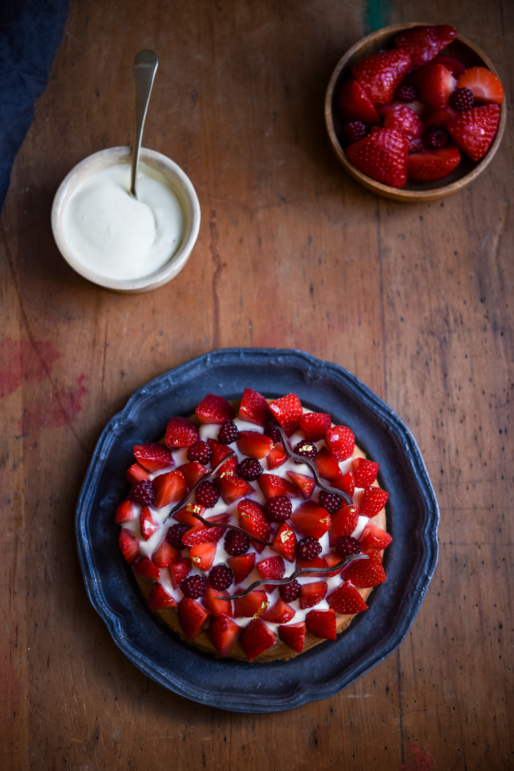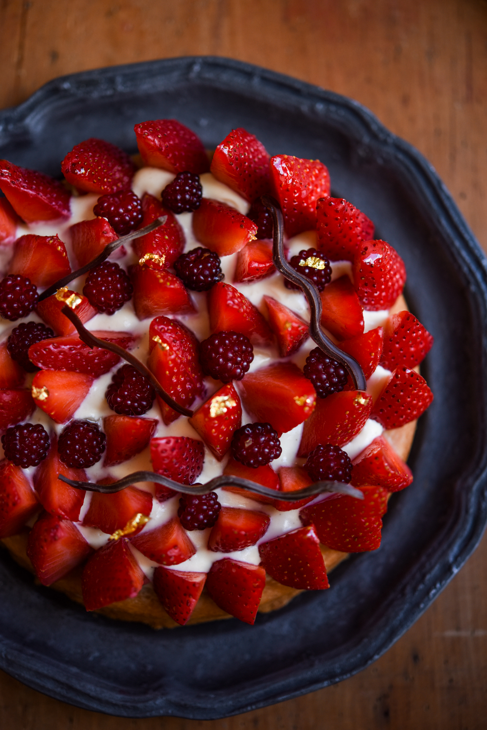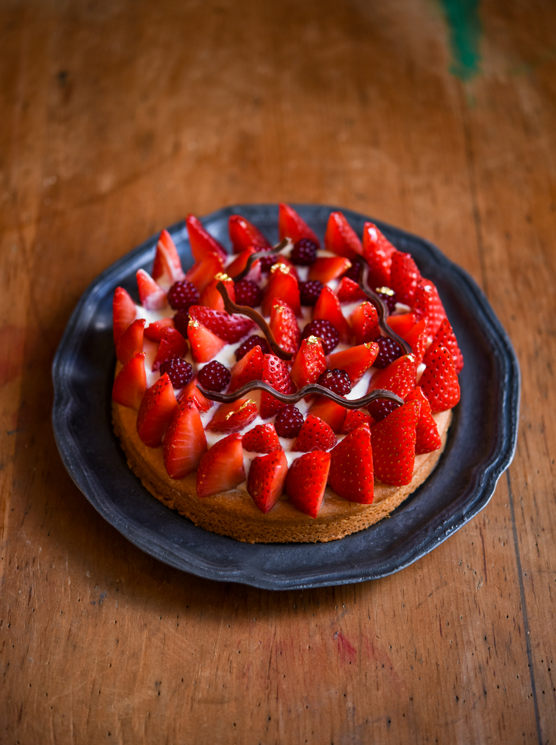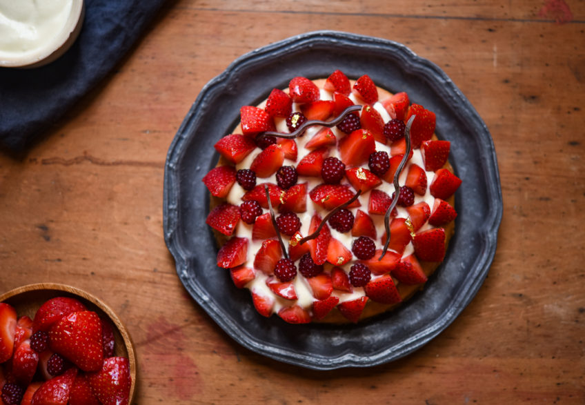 - Take the strawberries and cut the top of the strawberries and slice/half/quarter them however you feel based on your size of fruit. Arrange the fruit in a ring around the outer edge of the creme diplomat and then fill in the centre with more fruit. When you've finished with the strawberries, decorate with some of the raspberries / redcurrants, or just leave it as all strawbwerries.Using a sharp knife take small pieces of the gold leaf and decorate the strawberries with it. This is best eaten on the day you make it as the sable breton base begins to soften and the strawberries will start to weep. If you don't mind this, it will keep comfortably in the fridge for at least 2-3 days.