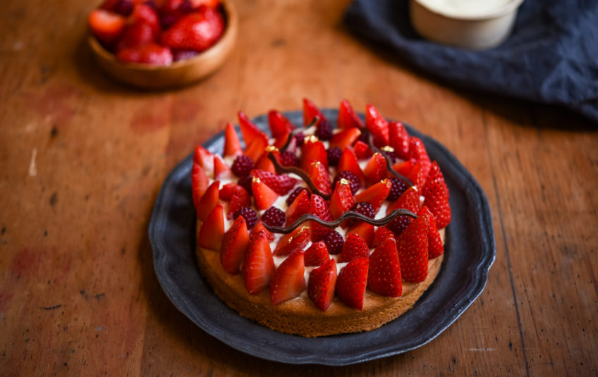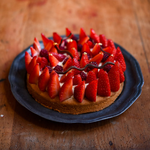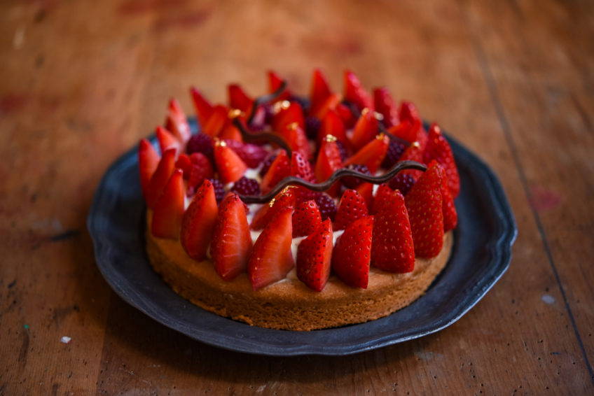 I decorated this strawberry sable breton with gold leaf and some leftover chocolate decorations I had from a previous entremet I had made. This makes quite a small tart, only 16cm in diameter, but it’s perfect for 4-5 very hungry people. It would easily serve 6 people with extra strawberries and cream on the side.
