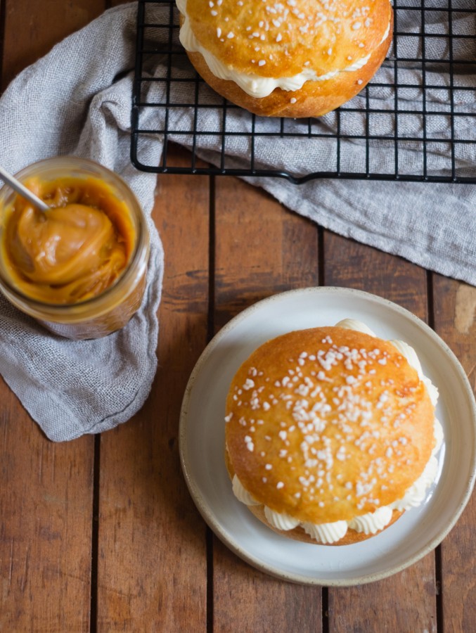 I took Edd Kimber’s recipe from Patisserie Made Simple. This is a fantastic book and if you want to start making patisserie for the first time, I really recommend this book. The only change I made was to add a hearty dollop of salt and pepper caramel to the centre of the buns along with the creme. You can of course leave this out and just fill the brioche with the creme legere. I used my standard salted caramel recipe, but added some crushed black and pink peppercorns to the mix, add it to taste, but be careful not to burn your tongue.