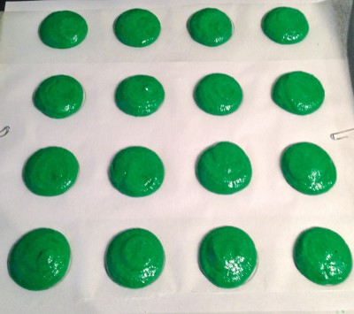 I didn’t know when to add the powdered food colouring, so I added it to the combined egg whites and ground almonds. This was a mistake! I had to really stir the batter to distribute the colour, this led to the problem with all of the air being knocked out of my macarons.