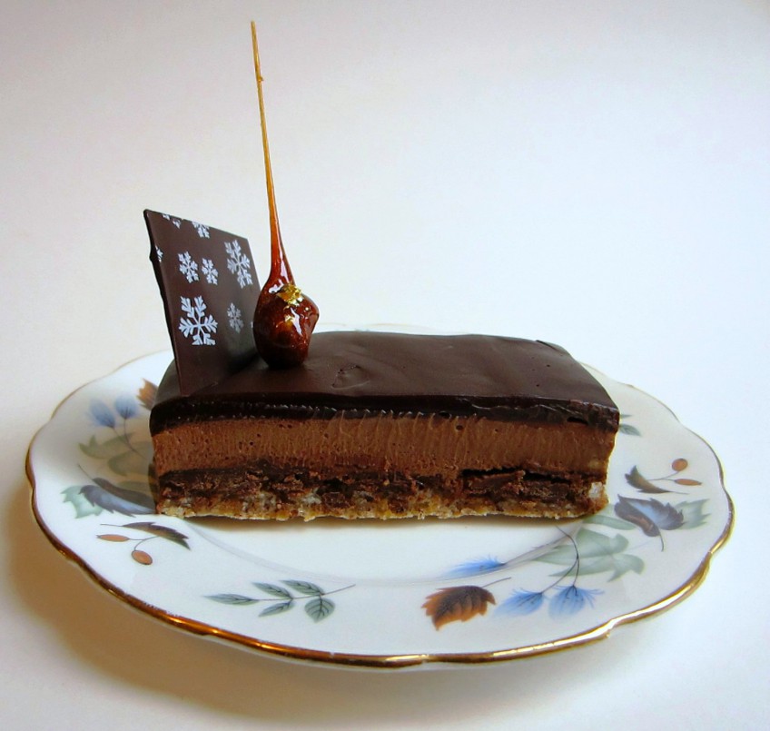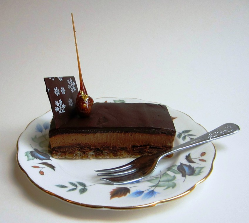 I’m not sure how authentic this recipe is, but I have adapted it slightly, as some elements were over complicated and I found some of the components didn’t work as well as other recipes I’d tried. The dessert is comprised of a hazelnut dacquoise, a feuilletine praline layer, chocolate mousse and dark chocolate ganache glaze.